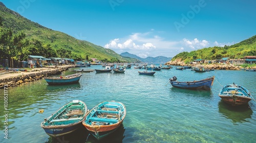 Serene Fishing Village with Small Boats and Scenic View