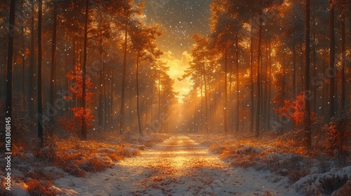 forest, sunlight, tree, path, autumn, snow, nature, landscape, calmness, beauty, scenery, foliage, light, shadow, season, peaceful, outdoors, wilderness, environment, warm, cold, serenity, exploration, adventure, bright, vibrant, mist, atmospheric, rustic, calming, reflections, depth, harmony, picturesque, seasonal, gold, scenic, enchanting, magical, forest floor, leaf, branch, winter, twilight, dusk, journey, escape