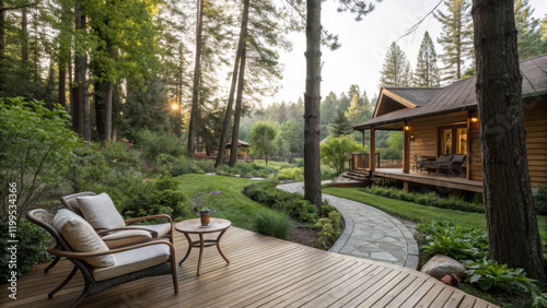 forest, retreat, wooden, deck, seating, nature, relaxation, tree, cabin, peaceful, greenery, path, garden, landscape, tranquil, sunlight, chair, table, cushion, patio, rural, escape, scenic, environment, natural, filed, backyard, leisure, calm, wilderness, countryside, serene, get-away