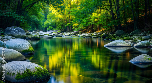 Serene Forest River Scene with Sunlight Reflections