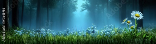 Serene forest scene with blooming flowers and soft blue light filtering through trees.