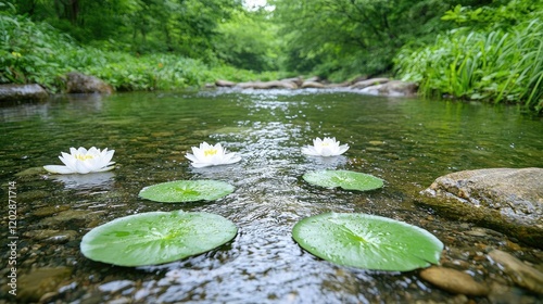 Serene forest stream with white water lilies, calm water, lush greenery background; nature scene