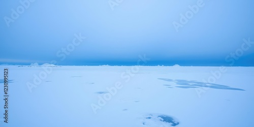 Serene frozen landscape of icy blues and frosty whites, cold weather, blue sky