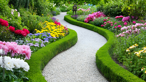garden path, flowerbed, hedge, peony, colorful flowers, floral arrangement, garden design, landscaping