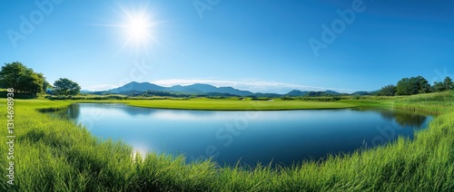 golf course, duck pond, landscape, scenic, nature, water, green, sunny, mountain, outdoors, tranquil, beautiful, summer, peaceful, blue, sky, calm, fresh, relaxing, golf, tree, grass, exterior, resort, view, travel, vacation, holiday, serenity, calmness, calmness, attractive, picturesque, expansive, photo, digital, high-quality, full frame, panoramic, water feature, relaxation, tour tourism, destination, vacation spot, lake, river