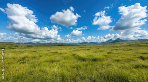 Serene grassy plains under a blue sky with fluffy clouds; ideal for travel brochures