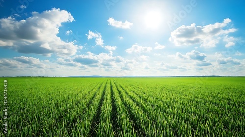 field, green, grass, sky, sun, cloud, nature, landscape, rural, scenery, farmland, agriculture, meadow, pasture, countryside, horizon, bright, day, summer, spring, view, scenic, beautiful, peaceful, tranquil, serene, calm, vibrant, lush, growth, plant, environment, ecology, fresh, clean, healthy, natural, abundant, harvest