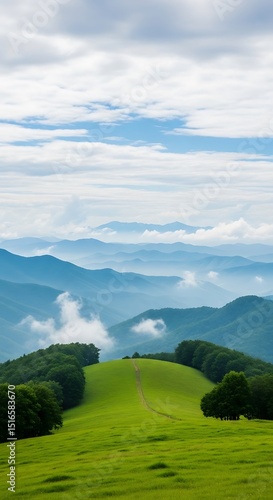 mountain, mountain, range, hill, hilltop, path, trail, grass, green, field, meadow, tree, forest, timberland, sky, cloud, mist, fog, landscape, scenery, nature, view, panorama, summer, spring, rural, scenic, beautiful, peaceful, tranquil, serene