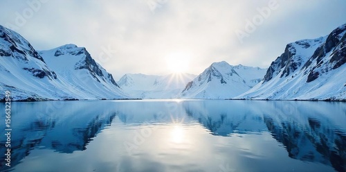 Serene Greenlandic Fjord Snow-Covered Mountains Reflecting in Icy Waters Under a Pale Winter Sun. A Breathtaking Majestic Landscape Perfect for Travel and Nature Photography.