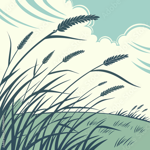 Serene Illustration of Tall Grass Blades Swaying in Breeze Against a Cloudy Sky and Green Hill