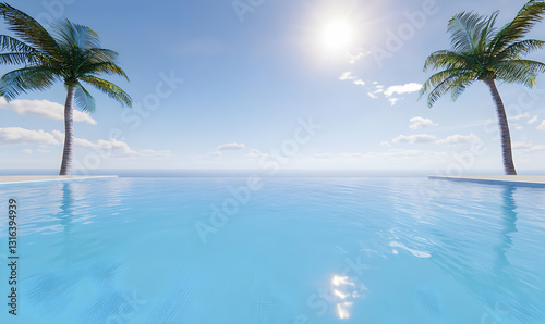 pool, ocean, water, sky, horizon, sun, palm, relaxation, summer, vacation, travel, calmness, resort, blue, tropical, landscape, nature, leisure, tour tourism, get-away, serenity, beauty, idylli, paradise, coast, calm, scene, environment, coastline, sunlight, marin, scenic, bright, peaceful, island, view, dream, escape, clear, ambience, warm