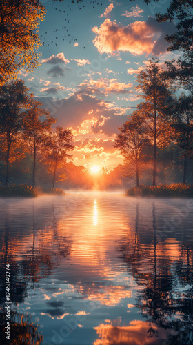serene lake at dawn with vibrant sunrise colors reflecting on water, surrounded by trees and flock of birds in sky