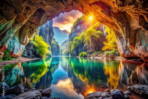 cave, lake, landscape, water, mountain, nature, scenic, sunlight, rock, canyon, river, sky, tree, forest, travel, tour tourism, outdoors, geology, formation, tranquil, peaceful, beauty, idylli, picturesque, calm, serene, colourful, vibrant