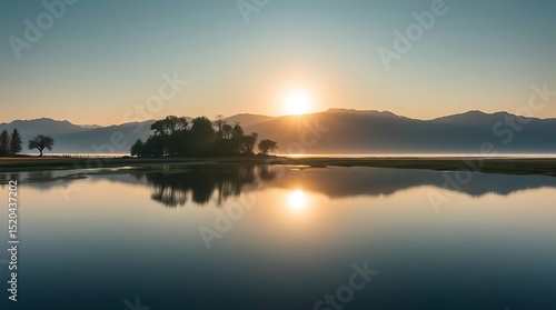 Serene lake landscape at sunrise or sunset with reflections on the water.