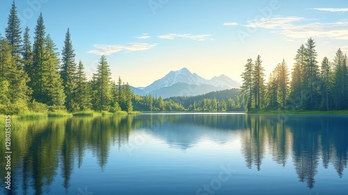 Serene lake mirroring forested mountains against a tranquil sky for outdoor recreation and nature inspired themes