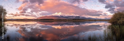 Serene lake reflecting a vibrant sunrise over snow-capped mountains. Calm water mirrors the colorful sky, dramatic clouds, and mountain peak. Tranquil scene of nature's beauty