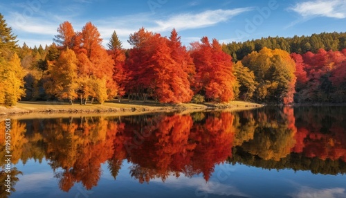 Serene Lake Reflecting Autumn Trees in Fiery Hues, generative ai