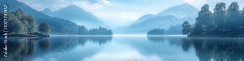 lake, mountain, water, sky, tree, nature, calmness, landscape, mist, blue, peaceful, scenery, environment, calm, horizon, sunlight, serenity, wilderness, beauty, scenic, stillness, atmosphere, flora, fauna, adventure, exploration, travel, relaxation, escape, vista, panoramic, photo, summer, wildlife, ecology, natural, view, pristine, remote, hiking, journey, vacation, retreat