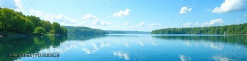 Serene lake scene with calm water and blue sky, peaceful, serene, sky