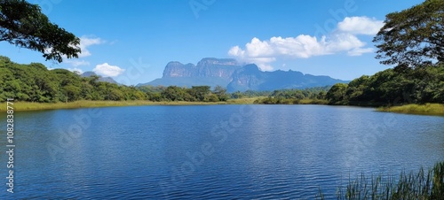 lake, mountain, sky, water, blue, nature, landscape, green, tree, cloud, hill, forest, tropical, scenery, outdoors, summer, day, calm, peaceful, serenity, calmness, travel, photo, beautiful, scenic, vista, view, panorama, horizon, clear, bright, sun, sunshine, fresh, airy, lush, foliage