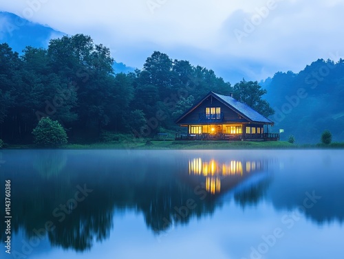cabin, lake, forest, tree, water, nature, evening, twilight, night, calm, serene, peaceful, tranquil, house, home, wood, light, glow, mist, fog, landscape, scenery, outdoors, country, get-away, escape, vacation, relaxation, stillness, quiet, solitude, beauty, mirror, symmetry, blue, green, dark, illuminated, cosy, rustic