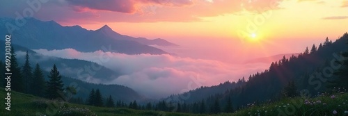 Serene landscape at dawn, mist shrouding mountains, conveying peace and inner tranquility Perfect for meditation, yoga, or spiritual reflection themes , reflection, awakening