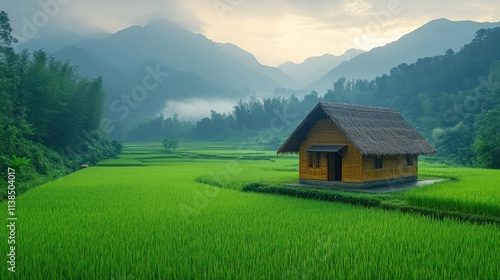 Serene landscape featuring a bamboo house amidst lush green rice fields and mountains.