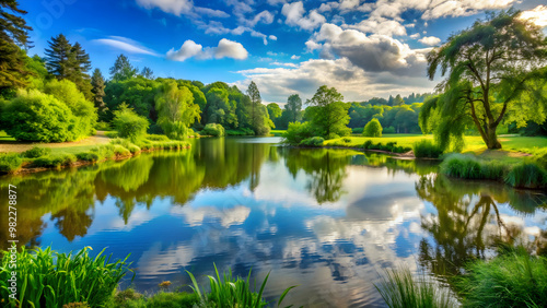 Serene landscape featuring a tranquil lake surrounded by lush greenery, scenic, calm, nature, water, reflection, peaceful