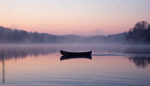 Serene landscape featuring calm lake at dawn, with single canoe gliding through misty water. soft pastel colors of sky reflect beautifully on surface, creating tranquil atmosphere
