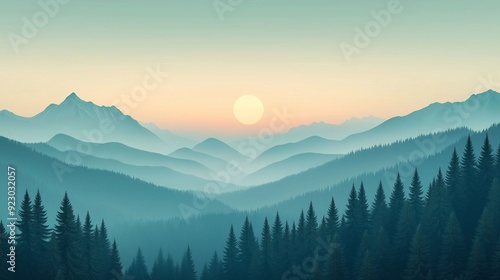 Serene landscape of misty mountains at sunrise, with layers of pine-covered hills and a soft pastel sky.