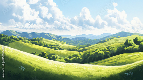 Serene landscape of rolling green hills under a bright blue sky with fluffy clouds, ideal for nature themes