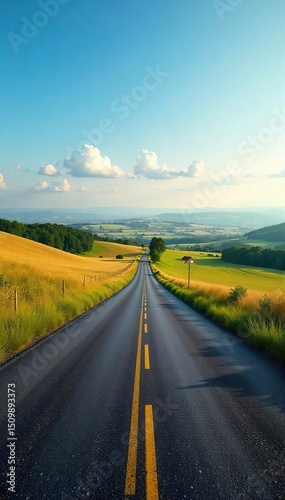 Serene landscape photo of a winding country road disappearing towards a distant horizon over rolling hills and fields under a clear sky Ideal for travel, nature, and rural themes , countryside, sky