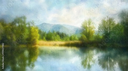 Serene Landscape with Calm Waters Reflecting Lush Green Trees and Mountains in a Soft, Dreamy Style Evoking Nature's Tranquility and Peaceful Essence