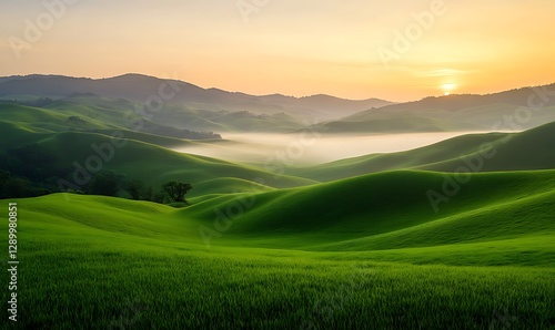 Serene landscape with rolling green hills, fog, and a warm sunrise in the background.