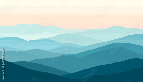 Serene layered mountain range with forested ridges, depicted in shades of blue and teal.