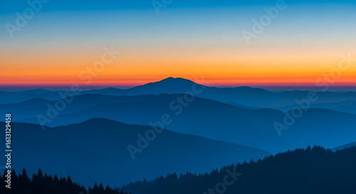 mountain, landscape, sunset, mountain chain, sunrise, nature, blue, sky, dusk, dawn, scenery, peak, hill, view, wilderness, scenic, panorama, vale, ridge, environment, travel, background, light, forest, tree, evergreen, silhouette, range, horizon, cloud, altitude, calm, tranquil, peaceful, serene, gradient, warm, colours, sunlight, tour tourism, vacation, journey, adventure, destination, highland
