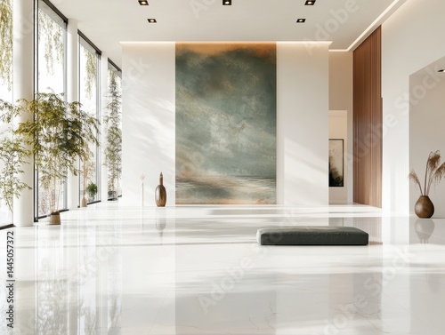Serene light filled home hall interior elegant artwork minimalist decor soft daylight stylish design simple form clean lines open space aesthetic appeal