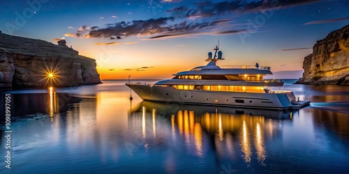 yacht, luxury, calm sea, dusk, cliff, elegance, peaceful, maritime, travel, adventure, mediterranean, scenic, coastline, sunset, mooring, silhouette, ocean, landscape, water, vacation, summer, relaxation, get-away, sailing, exploration, leisure, architecture, lifestyle, night time, calmness, marin, harbor, picturesque, dreamy, night scene, view