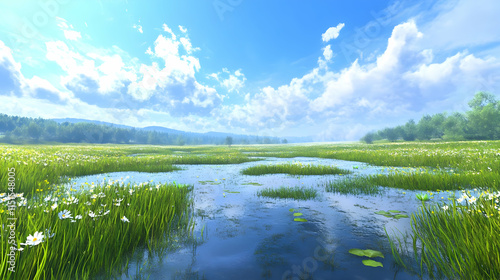 Serene Meadow Landscape: Stunning Water Reflections and Blooming Wildflowers