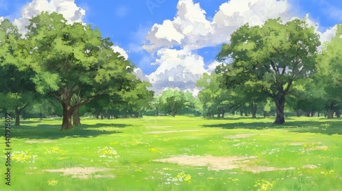 Serene meadow Sunlight dances on vibrant green grass lush trees under a blue sky