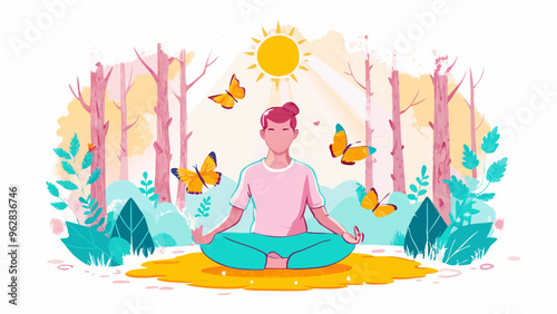 forest, serene, meditation, nature, mindfulness, butterfly, sunshine, relaxation, calmness, peacefulness, harmony, zen, spiritual, calm, well-being, illustration, yoga, balance, bliss, concentration, contemplation, healing, wellness, vibrant, colourful, leaf, tree, landscape, bright, sun, energy, positivity, male, sitting, lotus, position, practice, mind, body, spirit, health, quietude, solitude, season, autumn, vector