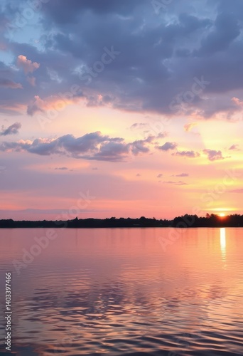 Serene Michigan sunset mirroring in tranquil lake waters, stillness, scenery, sunset colors
