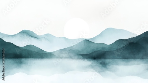 minimal, abstract, landscape, mountain, water, serene, peaceful, nature, mist, fog, blue, green, silhouette, calm, artistic, scenery, tranquil, light, shadow, horizon, design, illustration, environmental, atmospheric, quiet