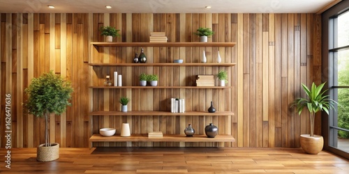 Serene Minimalist Interior Design Featuring a Multi-Level Wooden Shelving Unit Adorned with Greenery and Decorative Vessels Against a Warm Wood-Paneled Wall