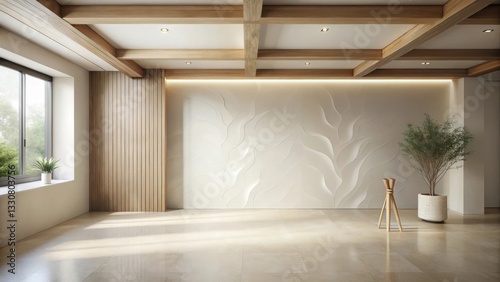 Serene minimalist interior design featuring a textured wall, wooden ceiling beams, and a potted plant