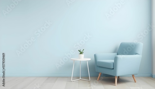 Serene Minimalist Interior Light Blue Armchair and Small Plant on a Table