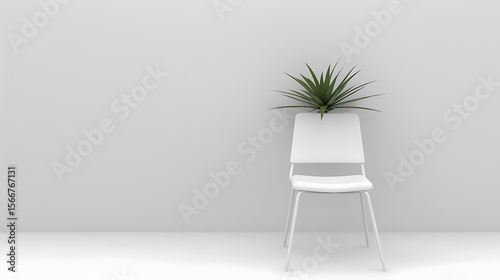 Serene minimalist interior scene with a vibrant plant resting on a sleek white chair showcasing