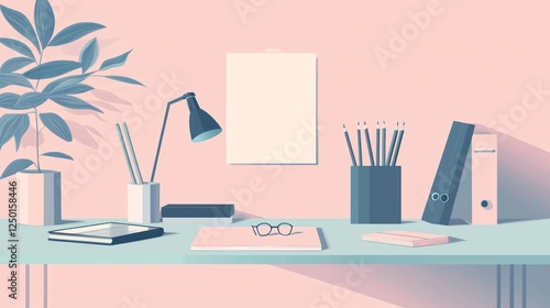workspace, desk, office, minimal, pastel, design, illustration, modern, clean, simple, organised, aesthetic, calm, serene, peaceful, creative, study, work, art, elegant, notebook, plant, lamp, table, room, interior, pink, blue, green, style, flat, graphic, geometric, book, folder, goggles, accessory, drawing, paper, colours