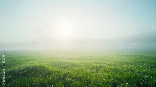 Serene Misty Morning Over Green Field with Soft Sunlight