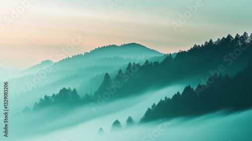 Serene misty mountain at dawn with soft pastel skies and silhouettes of pine trees